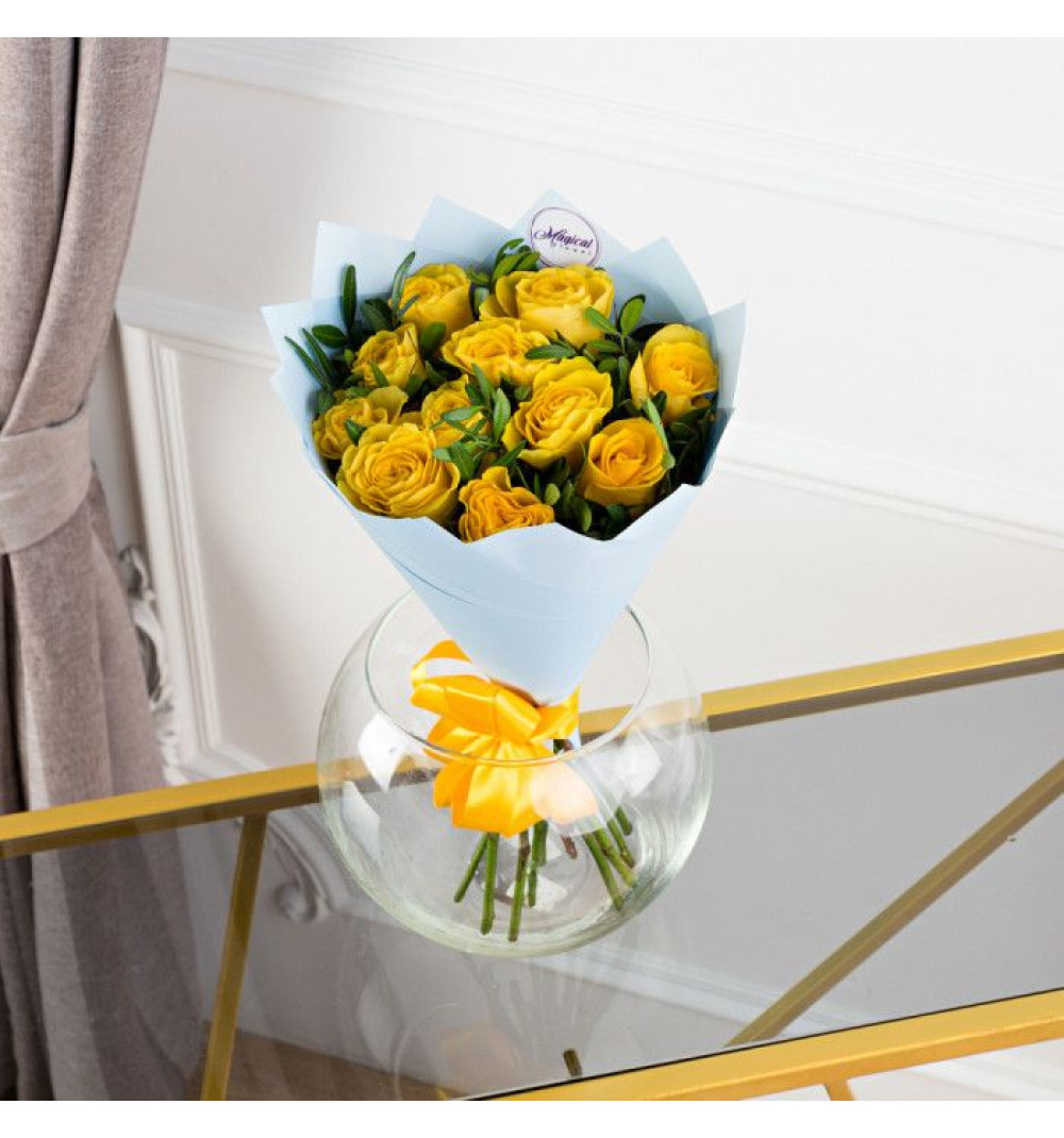 Букет из 11 желтых роз - это яркое и солнечное проявление радости и дружелюбия. Желтый цвет роз символизирует счастье, радость и дружбу, что делает этот букет идеальным подарком для того, чтобы выразить свои наилучшие пожелания или поздравления. Зелень добавляет свежести и жизнерадостности букету, создавая гармоничное сочетание цветов и текстур. Этот букет станет замечательным подарком для близких и дорогих людей, а также прекрасным способом поднять настроение и поделиться положительными эмоциями.