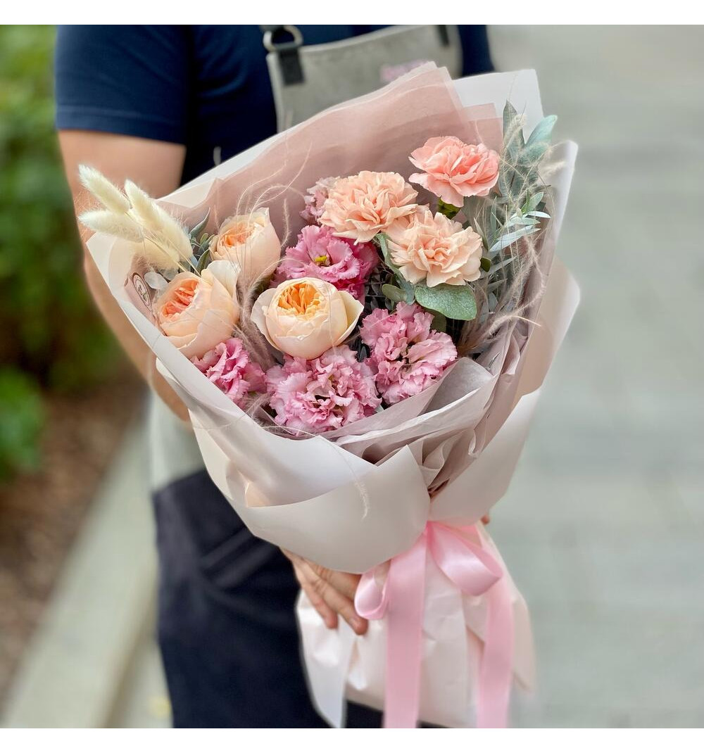 Композиция с пионовидными розами "Джульетта", эустомой и диантусами - воплощение изысканности и романтики. Нежные оттенки пионовидных роз "Джульетта" создают волшебную атмосферу, а эустома добавляет легкости и воздушности. Диантусы придают букету свежесть и прекрасный аромат, делая его идеальным подарком для особых моментов и праздников. Этот букет точно покорит сердце получателя своей красотой и изяществом.